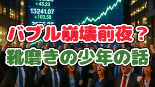 投資 靴磨きの少年の話┃投資家が学ぶべき大衆心理とバブルの教訓 株式投資で知られる「靴磨きの少年の話」を解説。1929年の大恐慌直前、街角の少年が株の話をしたことから投資家が市場の過熱を察知した逸話をもとに、バブルの兆候や群衆心理、現代投資への応用まで丁寧に紹介し、冷静な判断の重要性を解説します。 2025.09.26 投資